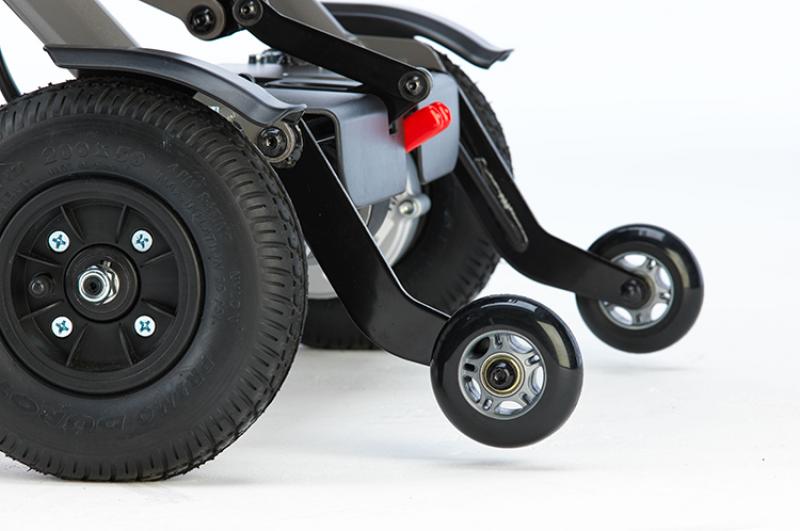 Mechanismus skládání v jednom kroku: skládací mechanismus umožňuje snadné složení elektrického vozíku do kompaktních rozměrů 590 x 370 x 810 mm.