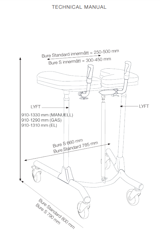 Rehabilitační chodítko Bure Standard S je dodávané v hydraulické nebo elektrické verzi. Toto rehabilitační chodítko je speciálně navrženo pro ústavní péči a prostředí, která vyžadují větší manévrovací prostor pro uživatele. Rehabilitační chodítko Bure Standard S se dokonale hodí do stísněných prostor, například v domácnostech nebo v některých pečovatelských zařízeních. Bure S projde většinou dveří o šířce 70 cm a více.