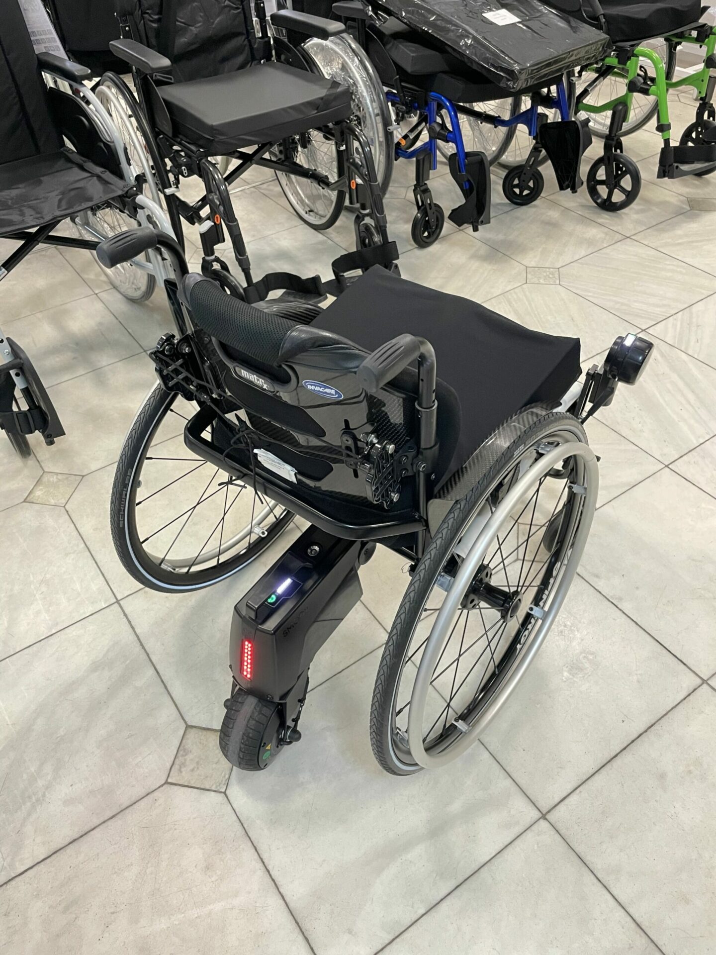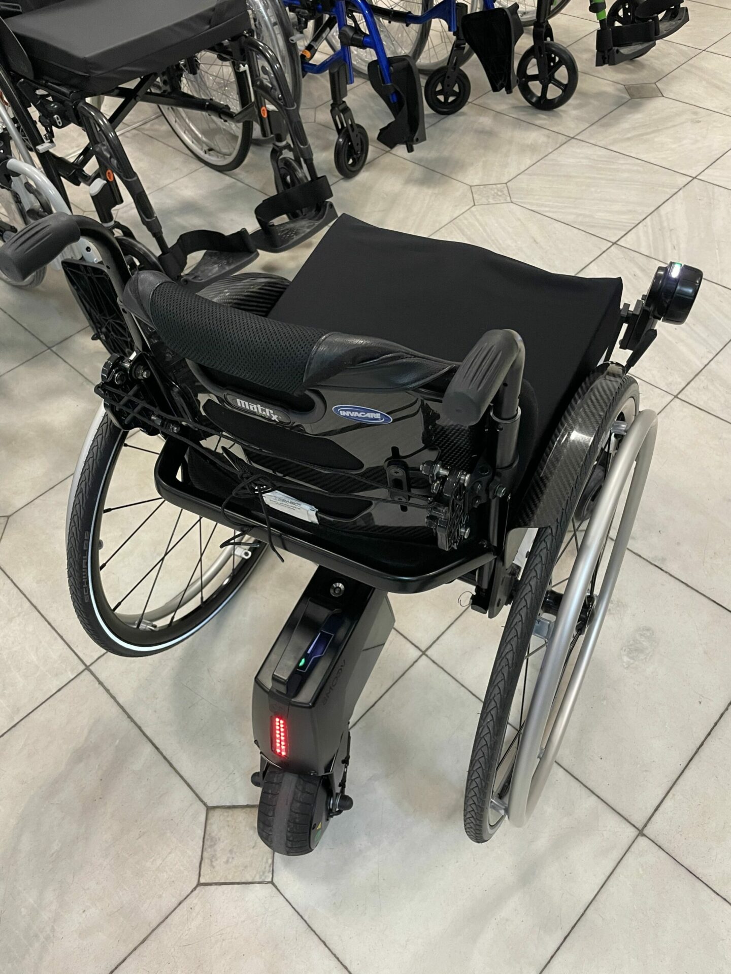 Vybavenost pohonu: varianta držáku pohonu na aktivní vozík s pevným rámem / na osu zadních kol, automatická nabíječka, bezdrátový ovladač, kompletní balení s originální krabicí.